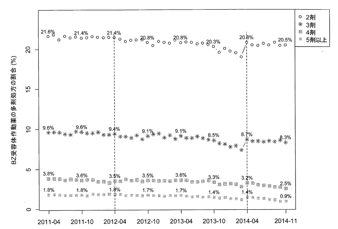 図 ベンゾジアゼピンの多剤処方割合の経年変化 (奥村 et al., 2015)